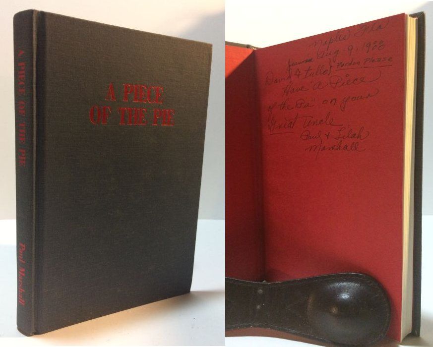 Marshal, Paul. A Piece Of The Pie. United States: Self Published, 1987. 1st Edition 1st Printing. 8vo - over 7¾" - 9¾" tall. Hardcover. Book. Inscribed by Author(s). Very Good Clean text. Gently read. General toning to the extremities with some mild wear to the boards. No previous owner's markings. Black boards and spine with gold spine lettering. $5.00
