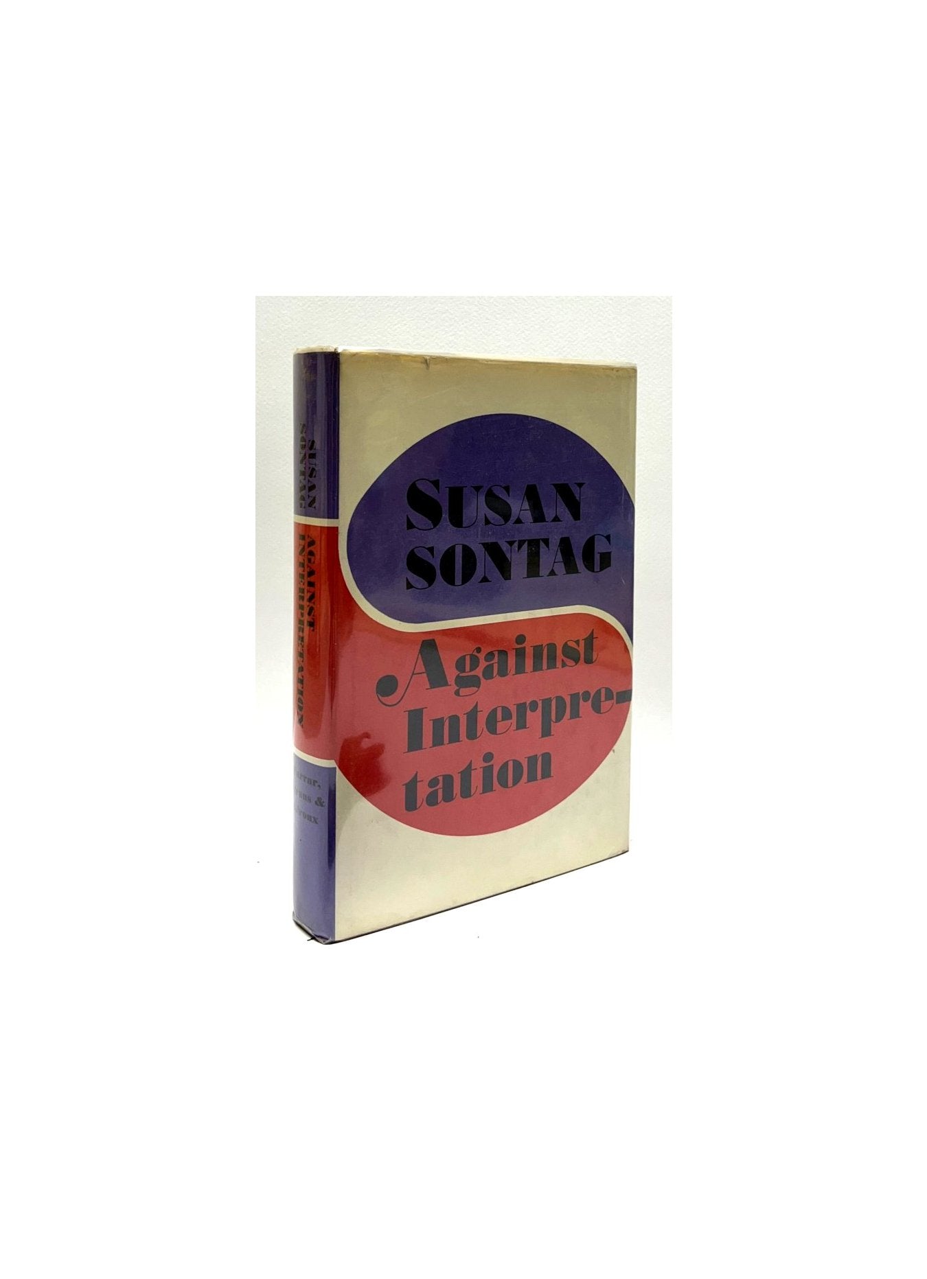 Sontag, Susan. Against Interpretation. United States: Farrar Strauss & Giroux, 1966. 1st Edition. 8vo - over 7¾ - 9¾" tall. Hardcover w/ jacket. Book. Signed by Author(s). Near Fine / Near Fine. Signed by the Author. Clean text. Unread. Lightly faded red top stain. Toning to the edges of the text. Light toning to the bottom edge of the front board and the base of the spine. White cloth boards / white spine, red and black stamped lettering. Dustcover not price clipped. Touch of shelf wear, small nick to the top edge of the front cover panel, light toning to the edges. New mylar cover. Sharp copy of Author's third book. Uncommon in this condition. $125.00
