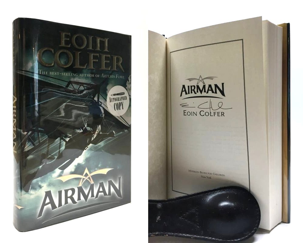 Colfer, Eoin. Airman. United States: Hyperion Books, 2008. 1st Edition 1st Printing. 8vo - over 7¾ - 9¾" tall. Hardcover w/ jacket. Book. Signed by Author(s). Fine / Fine. ISBN: 1423107500. Clean text. Unread. Dust cover not price clipped. Touch of shelf wear. Black boards, black spine, silver lettering. Beautiful copy. New mylar cover available on request. $45.00