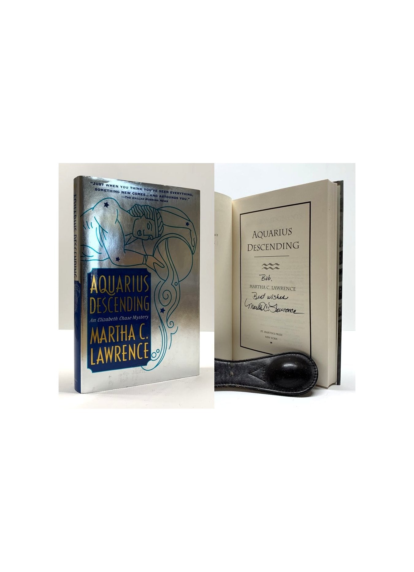 Lawrence, Martha C.. Aquarius Descending. United States: St Martins Press, 1999. 1st Edition 1st Printing. 8vo - over 7¾ - 9¾" tall. Hardcover w/ jacket. Book. Inscribed by Author(s). Near Fine / Near Fine. ISBN: 0312198299. Clean text. Appears unread. No previous owners names or bookplates. Small brown mark to the top edge - not a remainder mark. Grey boards and spine, blue lettering. Dust cover not price clipped. Touch of shelf wear. Nice copy. New mylar cover. $40.00