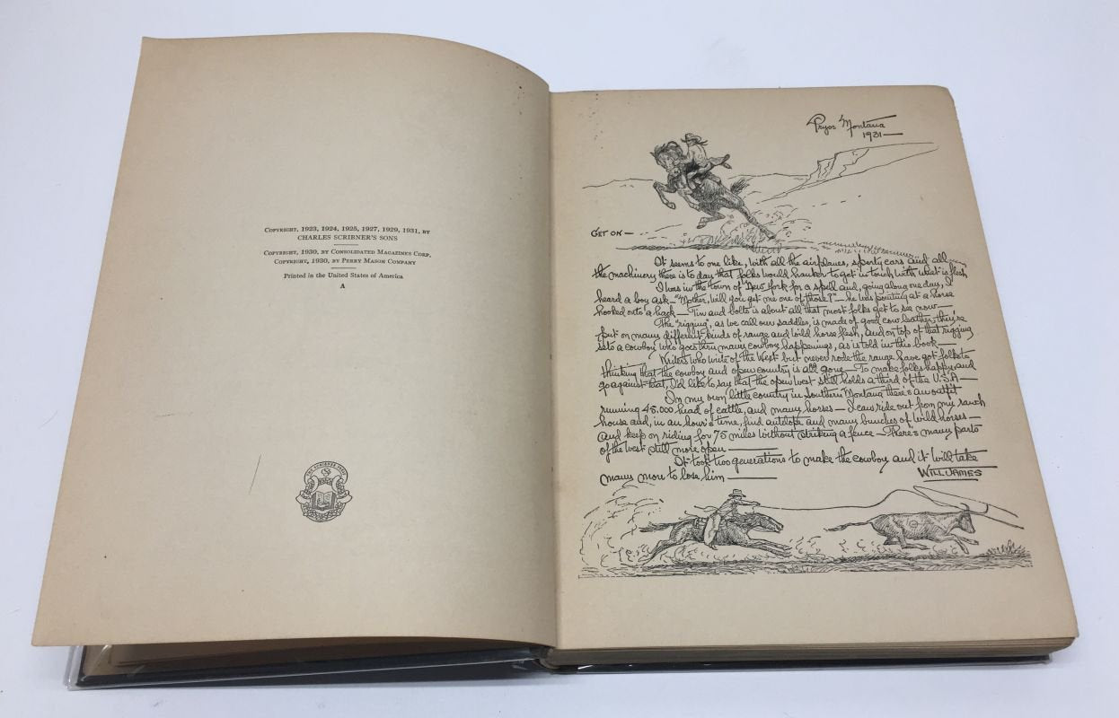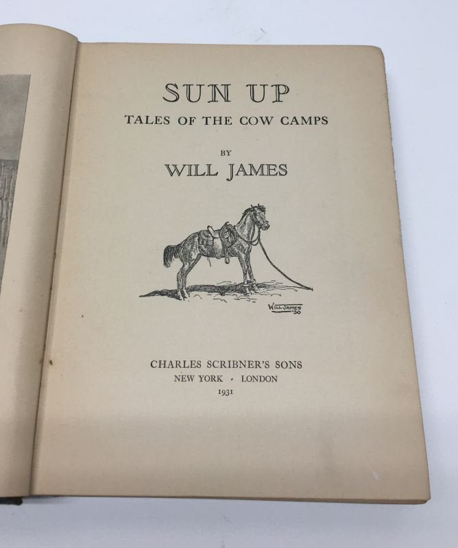 James, Will. Sun Up. United States: Charles Scribners & Sons, 1931. 1st Edition 1st Printing. 8vo - over 7¾ - 9¾" tall. Hardcover. Book. Signed by Author(s). Very Good Signed by the Author. Clean text. Gently read. Heavy toning to the edges of the text block. Mild wear to the extremities. James' cover art still vibrant. Green boards & black spine, gold spine lettering. Very rare signed 1st / 1st with all points of issue present. Protected inside custom made archival mylar sleeve. $1,800.00