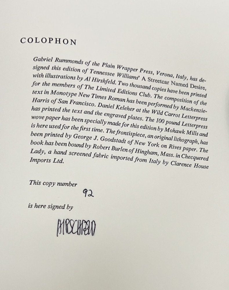 25% Off Summer Sale!! Tennessee Williams - A Streetcar Named Desire - Signed & Numbered 1982 - Limited Edition Club