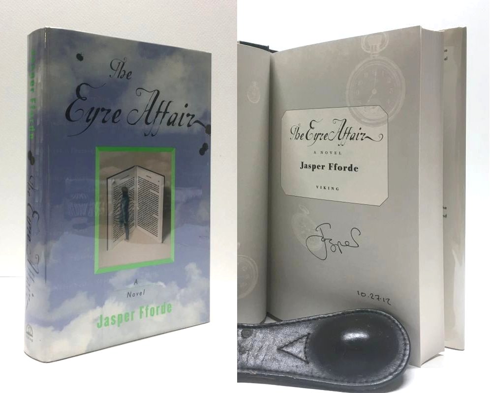 Fforde, Jasper. The Eyre Affair: A Thursday Next Novel. New York, New York, U.S.A.: Viking Press, 2002. 1st Edition 1st Printing. 12mo - over 6¾ - 7¾" tall. Hardcover w/ jacket. Book. Signed by Author(s). Fine / Fine. ISBN: 0670030643. Clean text. Appears unread. No previous owners names or bookplates. Mildest of compression to the spine heel and crown. White boards, black spine, green lettering. Dust cover not price clipped. Touch of shelf wear. Very nice copy signed by the author at the 2012 Texas Book Festival. New mylar cover. $35.00