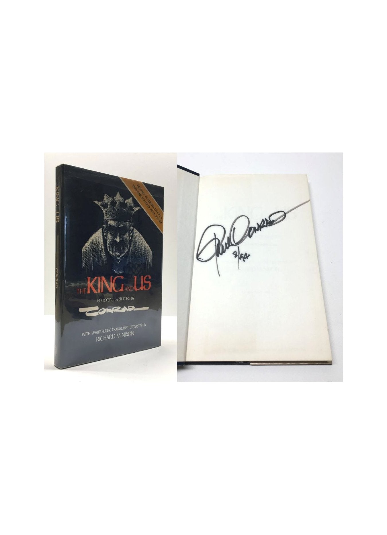 Conrad, Paul. The King And Us. Los Angeles, USA: Clymer Publications, 1974. First Edition 3rd Printing. 8vo - over 7¾ - 9¾" tall. Hardcover w/ jacket. Book. Signed by Author(s). Fine / Near Fine. Signed by the Author. Clean text. Unread. Small bump to the top edge of the front board. Black boards / spine, white lettering. Dustcover price clipped. Light shelf wear, with light rubbing to the edges. New mylar cover. $75.00