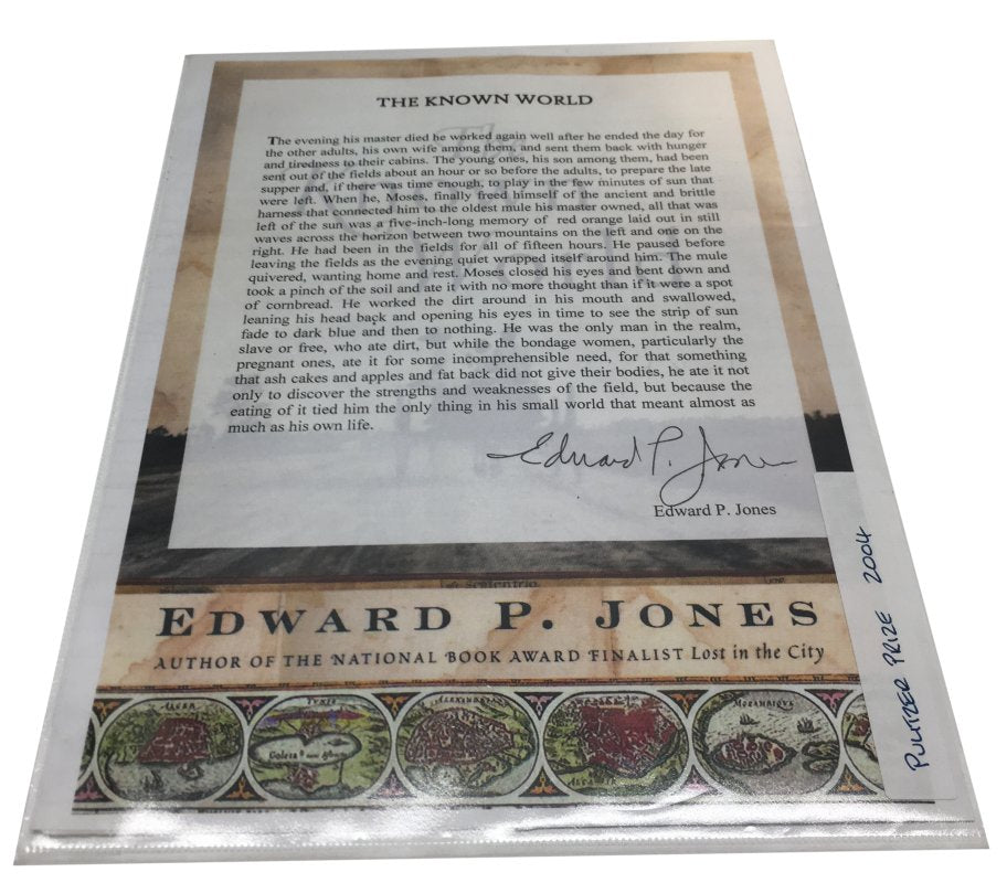 Jones, Edward P.. The Known World. New York, New York, U.S.A.: Amistad Press, 2003. Stated 1st Edition. 8vo - over 7¾ - 9¾" tall. Hardcover w/ jacket. Book. Signed by Author(s). Fine / Fine. ISBN: 0060557540. Clean text. Unread. Dust cover not price clipped. Touch of shelf wear and a tiny bump to the top corner of the front board. Maroon boards, black spine, gold lettering. Beautiful copy of the authors Pulitzer Prize winning work. New mylar cover available on request. Signed via enclosed Typescript. $85.00