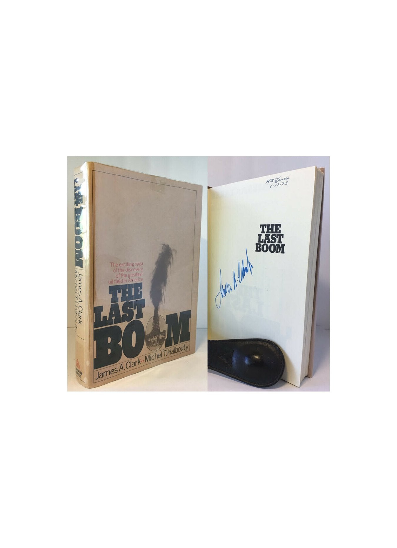 Clark, James A. & Halbouty Michel T.. The Last Boom. United States: Random House, 1972. 1st Edition 1st Printing. 8vo - over 7¾ - 9¾" tall. Hardcover w/ jacket. Book. Signed by Author(s). Very Good+ / Near Fine. Small library stamp to the top edge of the text block and one to the title page. Slightly shelf cocked spine, perhaps 2 degrees, with the binding tight. Pictorial boards and gold lettering. Price clipped jacket with a touch of compression to the crown and heel of the spine. $75.00