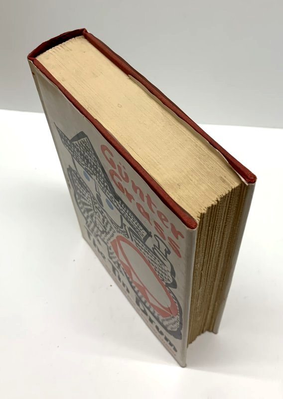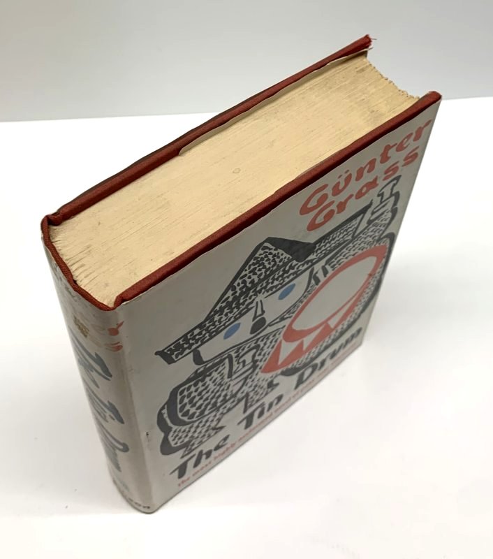 Grass, Gunter. The Tin Drum. United States: Pantheon, 1962. 1st Edition 1st Printing. 8vo - over 7¾ - 9¾" tall. Hardcover w/ jacket. Book. Very Good / Very Good. Clean text. Gently read. No previous owners names or bookplates. Mild toning to the text block edges. Some mild compression to the spine heel and crown with a shelf rubbing mark to the bottom edge a d some toning to the jacket spine. Red boards and spine, black and gold lettering. Dust cover not clipped. Mild shelf and edge wear with some toning and chipping to the jacket extremities. New mylar cover available on request. $100.00