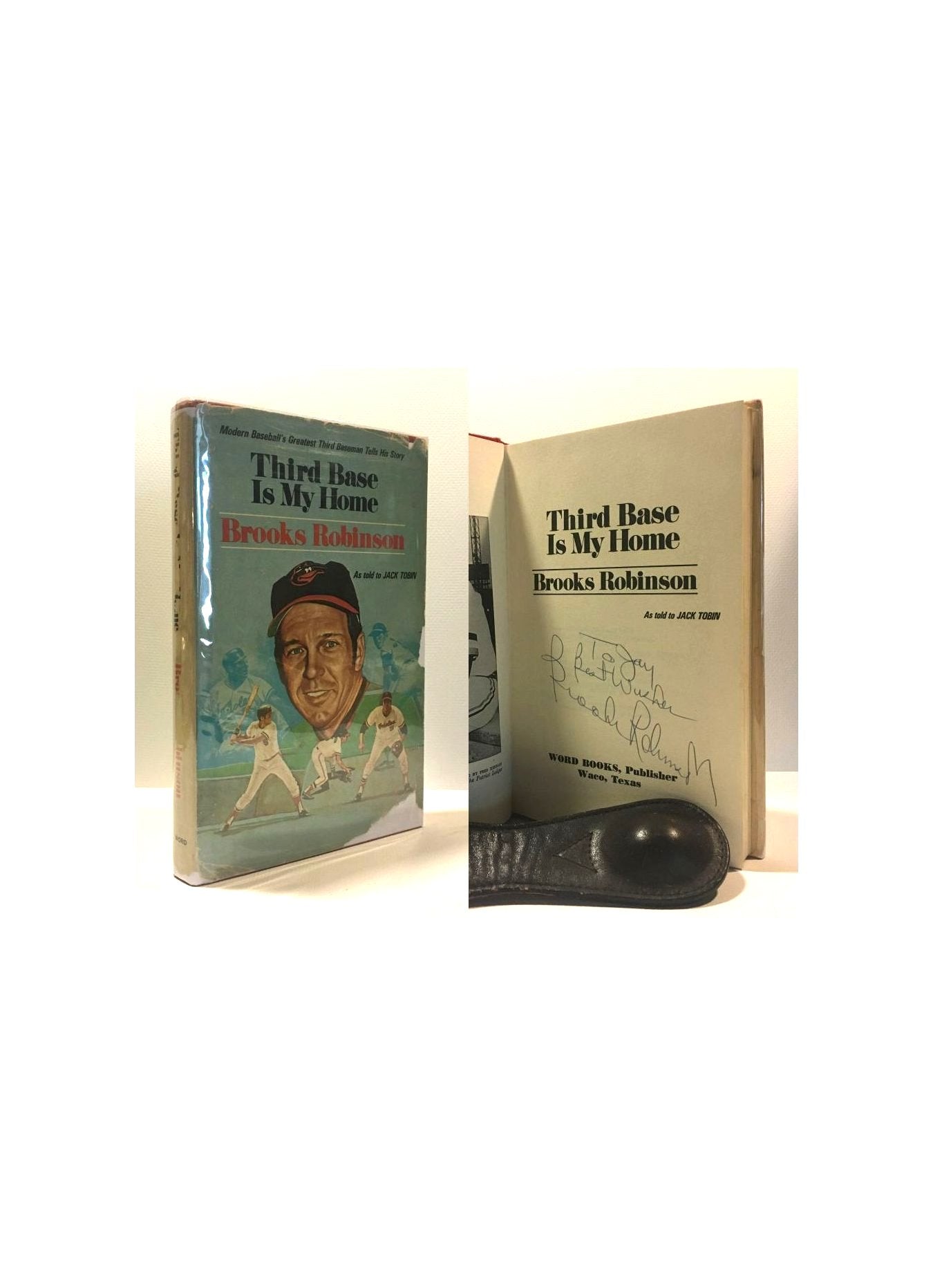Robinson, Brooks. Third Base Is My Home. United States: Word Books, 1974. 1st Edition 1st Printing. 8vo - over 7¾ - 9¾" tall. Hardcover w/ jacket. Book. Inscribed by Author(s). Very Good / Very Good. Inscribed by the Author. A number of pages within the volume are creased to the bottom leading edge corners though this appears to be due to incorrect storage and it actually appears unread with no fanning to the pages or spine. Text has some mild soiling to the extremities. Red boards showing bumping to the corners and mild wear to the crown and heel of the spine. Inscribed to the title page. Dust cover has significant chipping to the jacket extremities with wear to both flap creases and scuffing to the spine. Mild soiling / toning to the rear. Not price clipped. New mylar cover. $200.00