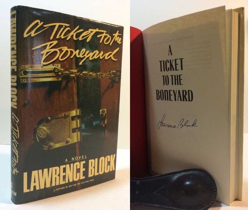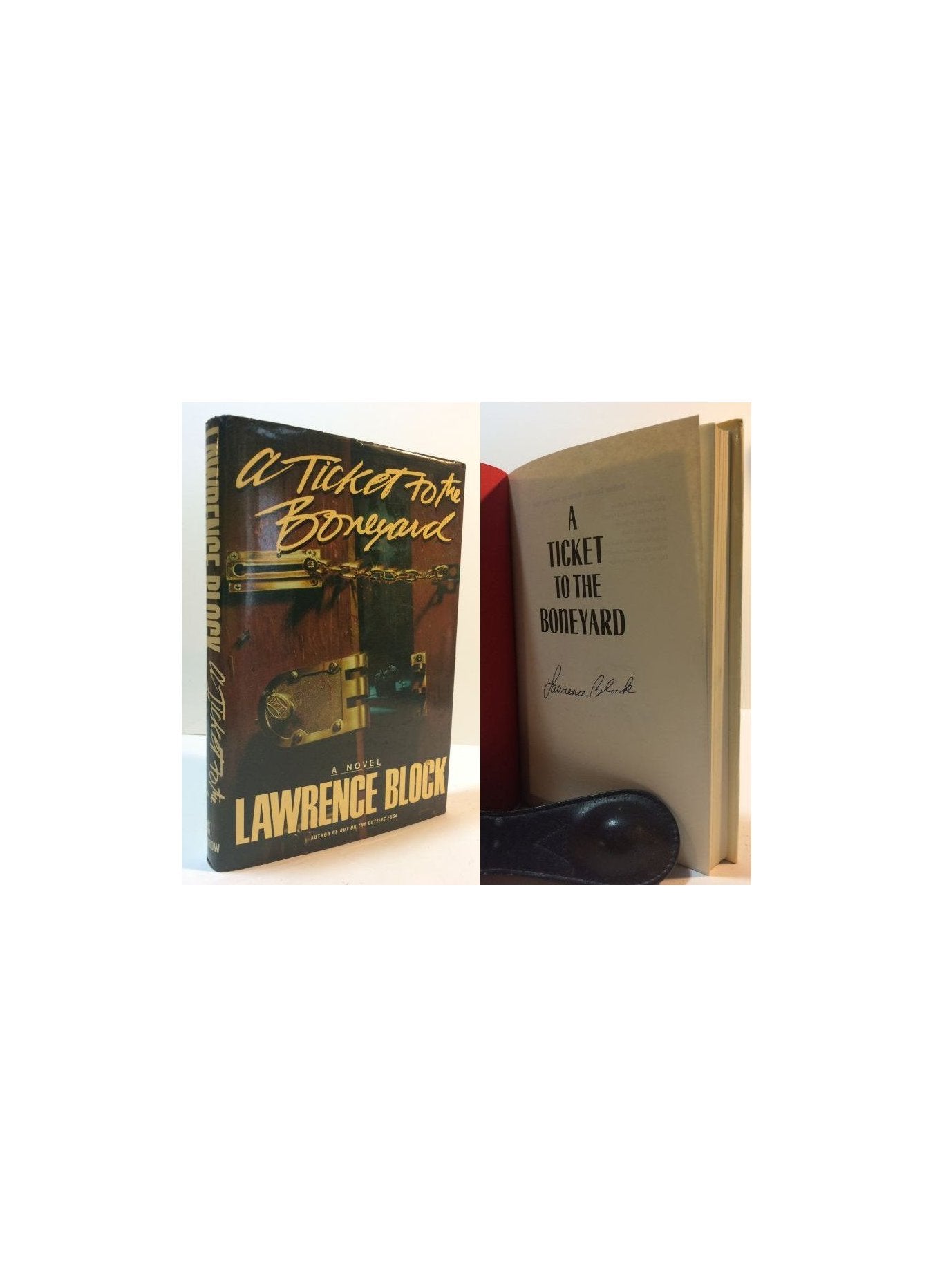 Lawrence Block. Ticket to the Boneyard. William Morrow and Company, 1990. 1st Edition 1st Printing. 8vo - over 7¾ - 9¾" tall. Hardcover w/ jacket. Book. Signed by Author(s). Near Fine / Very Good+. ISBN: 0688090702. Clean text. Unread. Spine in fine condition. From the personal collection of noted collector Larry Thurston and carries his bookplate to the FFEP. Touch of toning to the top edge of the text block, Brown boards and spine, gold lettering. Dustcover not price clipped. Some mild shelf wear with some light creasing to the extremities. Presents very well under new archival mylar cover. Sharp copy. $20.00