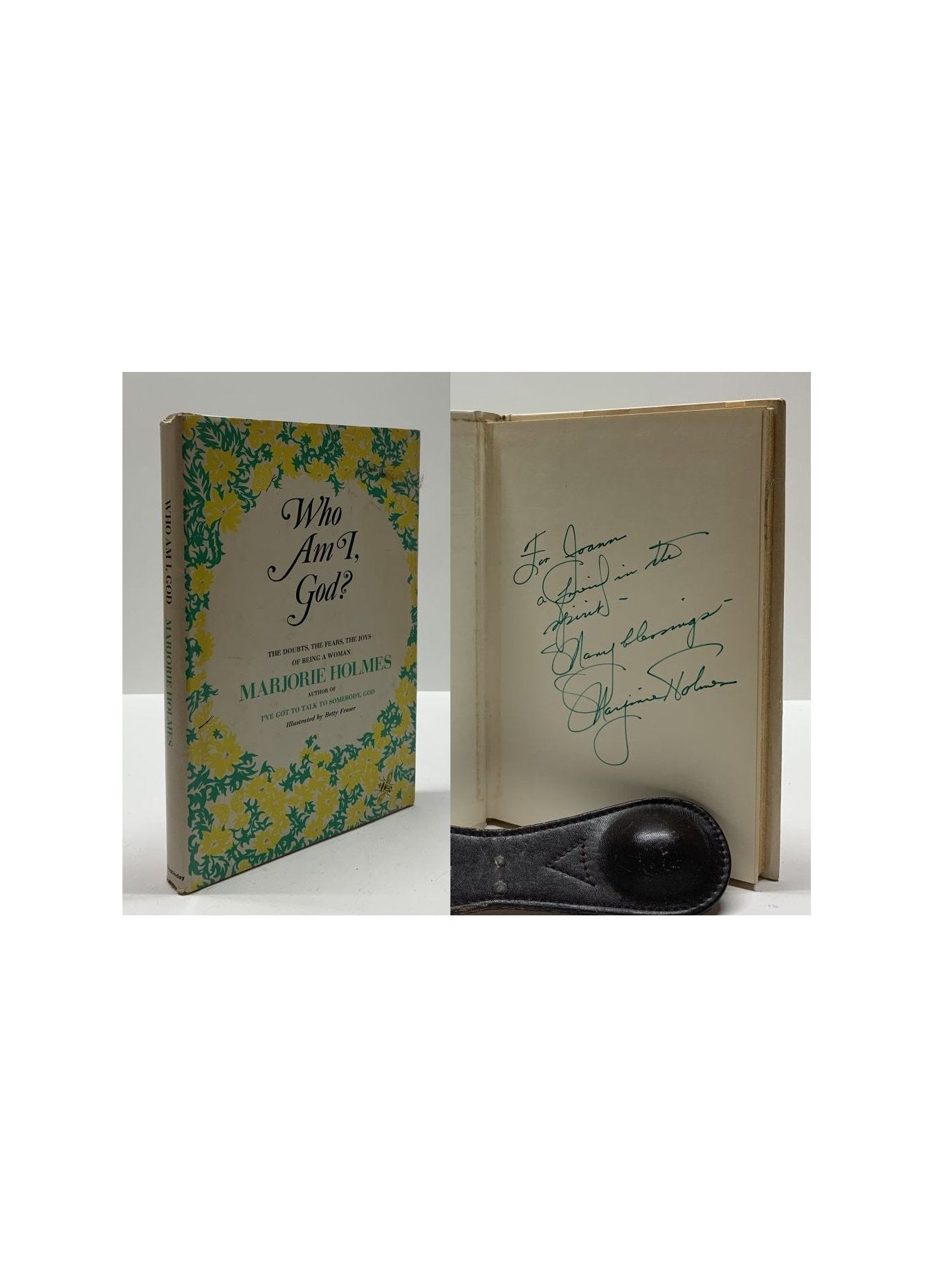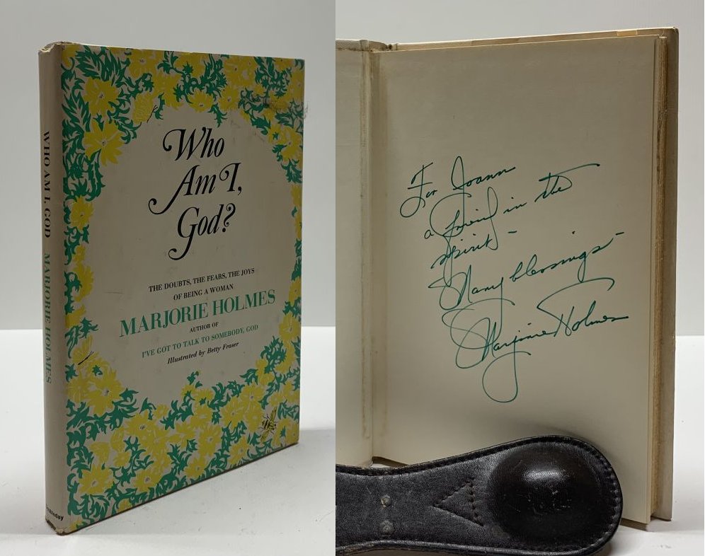 Holmes, Marjorie. Who Am I, God?. ill. Fraser, Betty. United States: Doubleday, 1971. 1st Edition Earlier Printing. 8vo - over 7¾ - 9¾" tall. Hardcover w/ jacket. Book. Inscribed by Author(s). Near Fine / Very Good. Clean text. Gently read. Light soiling to the top and lead edge of the text block. White boards & spine, gold spine lettering. Dust cover price clipped. Some shelf and edge wear, chip to the heel of the spine. Presents well under new mylar cover. $45.00