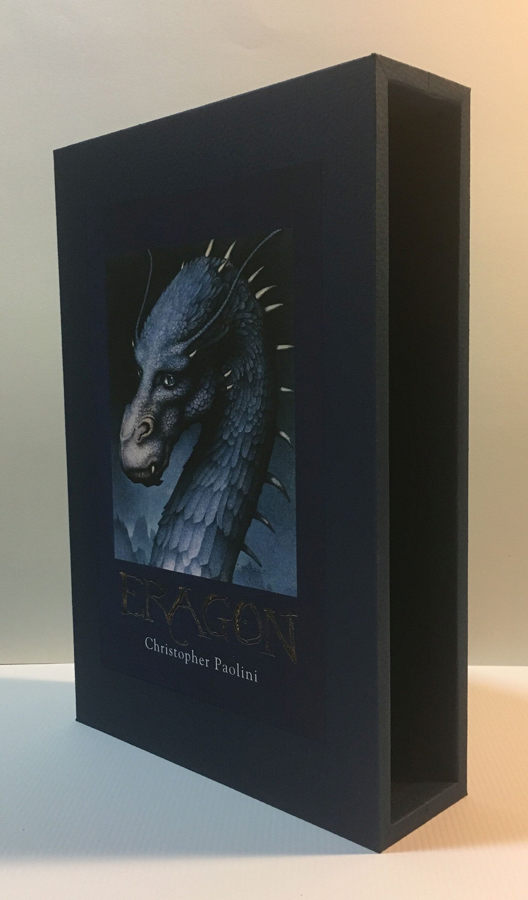 Christopher Paolini Eragon CUSTOM AFTERMARKET SLIPCASE Each slipcase is individually hand made from the highest quality materials using time honored traditional techniques, and it is important to note that there are no acidic glues, resins, or epoxy mixes in their construction. Any paper and cloth products used are also acid free. Please note that this slipcase has been designed to fit the 1st Edition / 1st Printing of the title and other copies are not guaranteed to fit. CONTACT ME FOR CUSTOM CASES MADE TO ORDER.