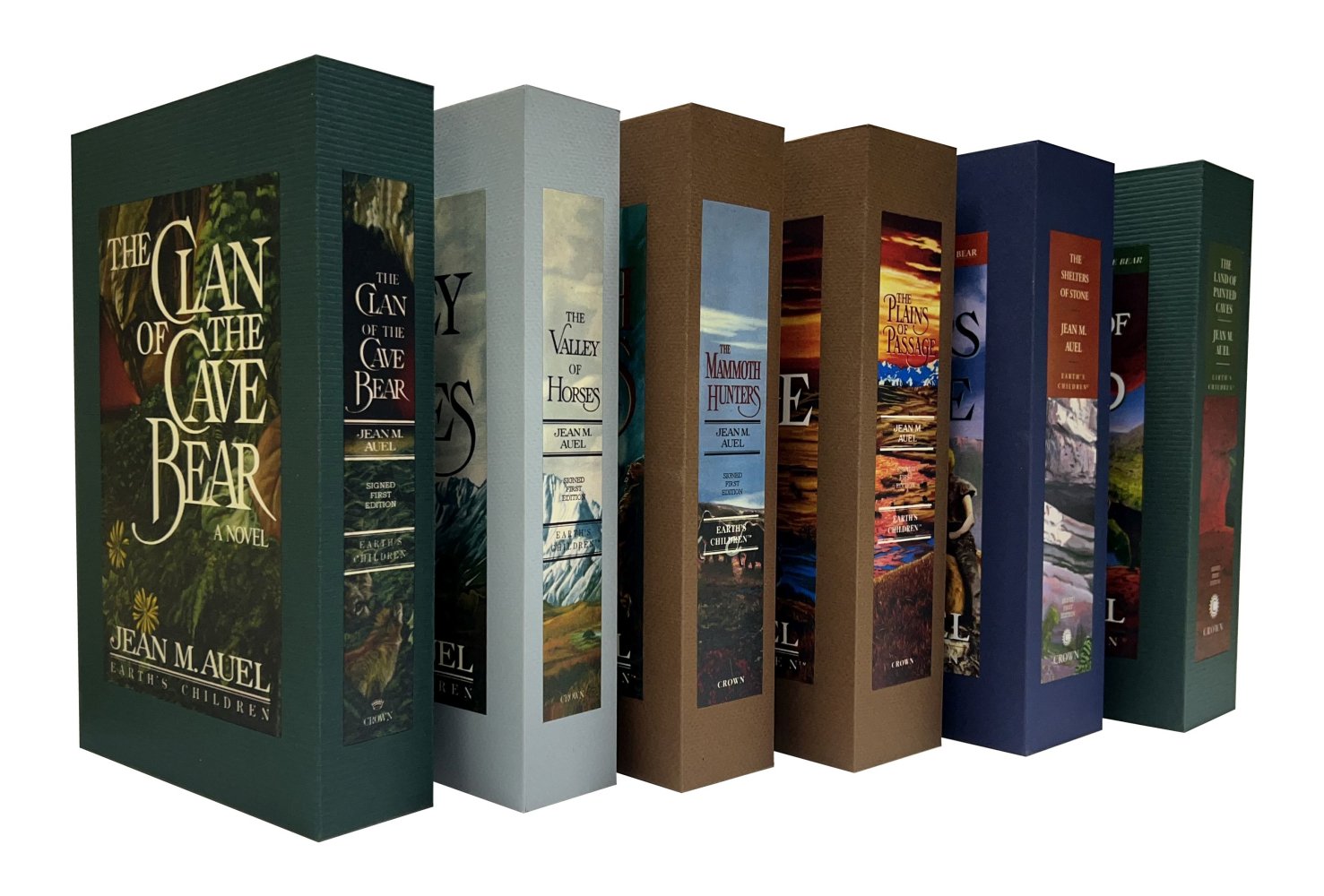 Jean M. Auel - Earth's Children Complete Set - The Clan of the Cave Bear; The Valley of Horses; The Mammoth Hunters; The Plains of Passage; The Shelters of Stone; The Land Of Panted Caves CUSTOM AFTERMARKET SLIPCASE SET. Each slipcase is individually hand made from the highest quality materials using time honored traditional techniques, and it is important to note that there are no acidic glues, resins, or epoxy mixes in their construction. Any paper and cloth products used are also acid free. Please note that this slipcase has been designed to fit the 1st Edition / 1st Printing of the title and other copies are not guaranteed to fit. CONTACT ME FOR CUSTOM CASES MADE TO ORDER.