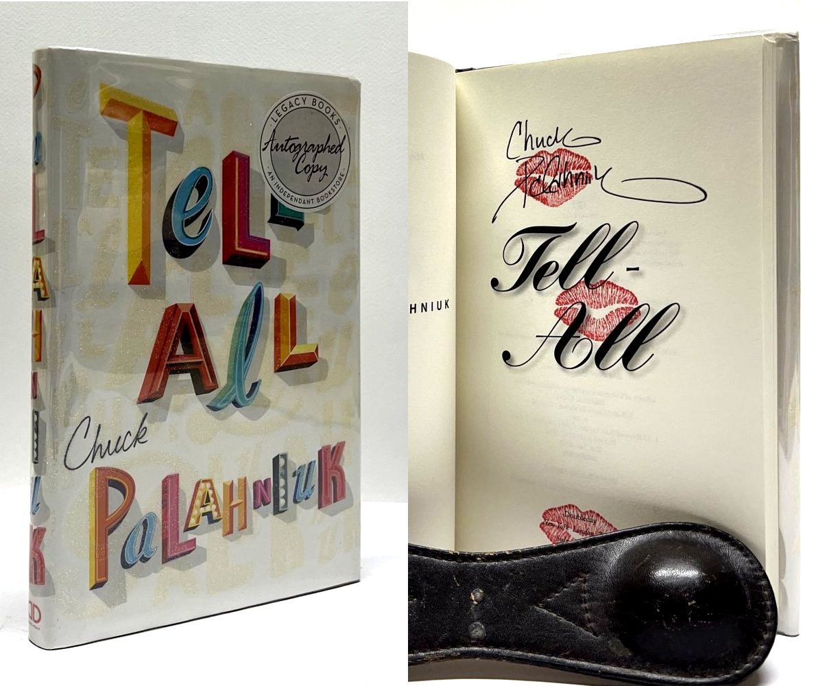 Palahniuk, Chuck. Tell All. United States: Doubleday, 2010. 1st Edition 1st Printing. 8vo - over 7¾ - 9¾" tall. Hardcover w/ jacket. Book. Inscribed by Author(s). Fine / Fine. ISBN: 9780385526357. Clean text. Unread. No previous owners names or bookplates. Light bump to the top corner of the front board. Grey boards and spine, silver lettering. Dust cover not price clipped. Touch of shelf wear. Nice copy. New mylar cover. $75.00