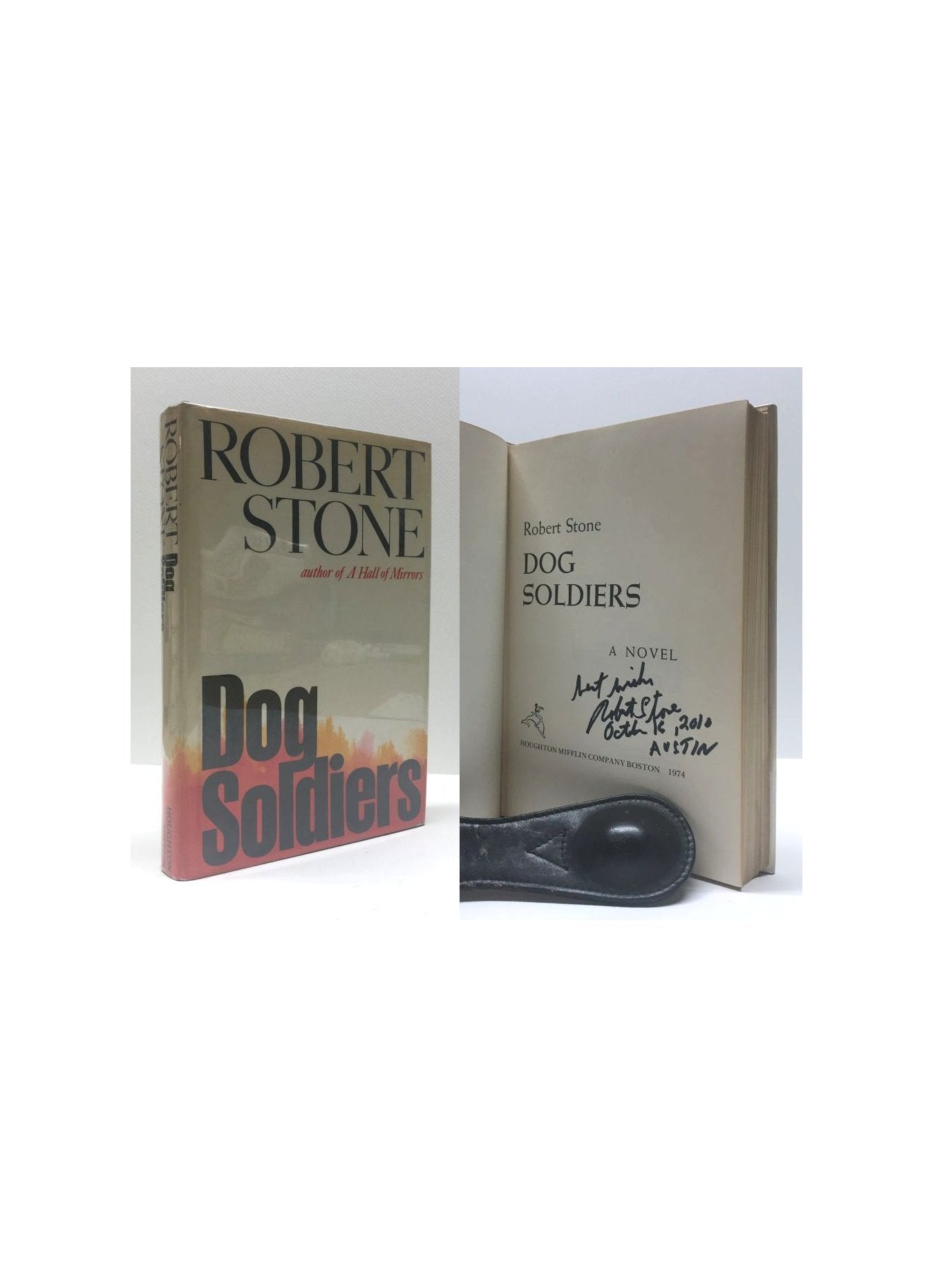 Stone, Robert. The Dog Soldiers. Wilmington, Massachusetts, U.S.A.: Houghton Mifflin & Co., 1974. 1st Edition. 8vo - over 7¾ - 9¾" tall. Hardcover w/ jacket. Book. Inscribed by Author(s). Fine / Near Fine. ISBN: 0395184819. Inscribed by the Author. Clean text. Unread. Mild toning to the edges of the text else fine. Brown cloth boards / spine, gold & black spine lettering. Dustcover not price clipped, 1174 code to the right of the text on the front flap. Light shelf wear, light creasing to the top edge. New mylar cover. Sharp copy. $400.00